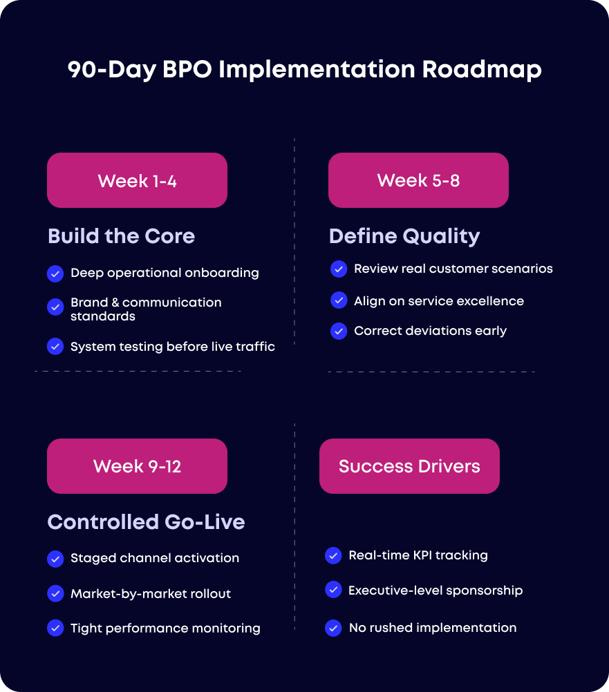 The first 90 days of a Global Expansion BPO engagement determine whether the partnership delivers its strategic potential or becomes a source of ongoing operational friction. The first four weeks must prioritize comprehensive knowledge transfer, product specifications, common customer scenarios, brand voice and communication standards, escalation procedures, and the unique aspects of your business model that affect operational requirements.