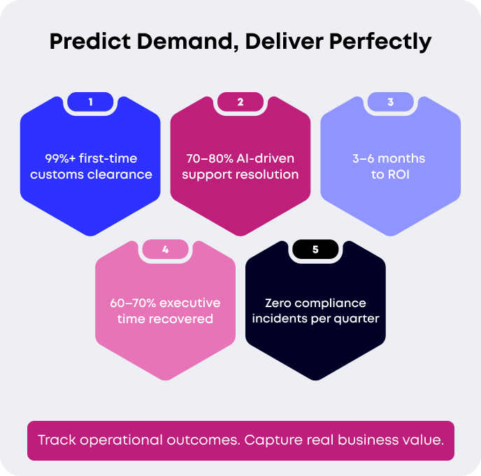 Performance measurement for Global Expansion BPO requires a metrics architecture that spans the full scope of services and connects operational performance to business outcomes. Operational metrics include customs clearance time and first-attempt success rate, customer service resolution rate and CSAT scores, compliance incident frequency, and fulfillment accuracy, each tracked against best-in-class benchmarks of 99%+ first-time clearance, 70–80% AI resolution rate, and zero compliance incidents per quarter.