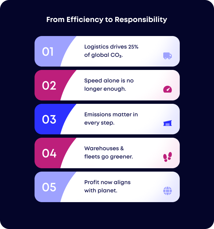 Modern logistics is evolving from efficiency-focused to responsibility-driven. This means organizations are no longer optimizing only for time and money, but also for environmental and social impact.