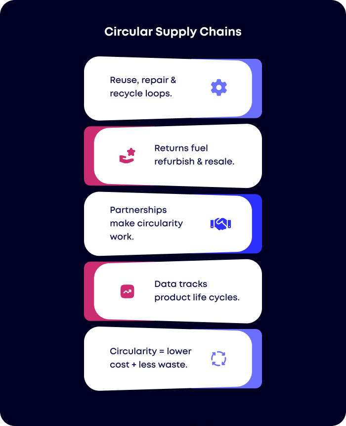 Reverse logistics, managing returns, refurbishments, and recycling — is a cornerstone of circularity. Instead of discarding used or returned items, companies are reintroducing them into circulation, extending their lifespan and reducing waste.