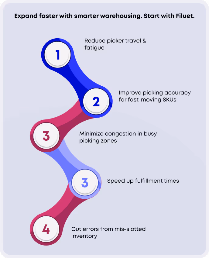 Better slotting improves picking accuracy, reduces travel time, and enhances worker productivity.