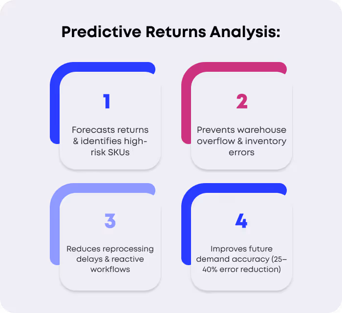 Returns are a major source of fulfillment inefficiency and data noise. Unpredictable returns patterns disrupt inventory accuracy, create reprocessing bottlenecks, and make forecasting unreliable. Predictive analytics makes returns more manageable.