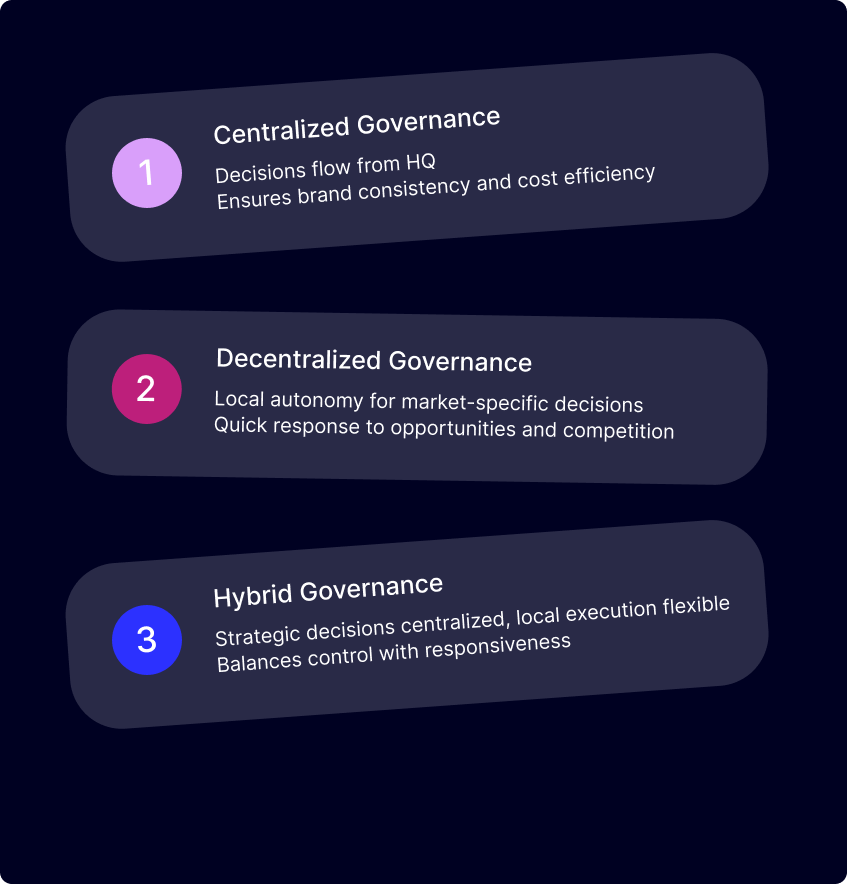 In a centralized governance model, strategic and operational authority consolidates within a core leadership team, typically at headquarters. The central team makes all significant decisions, establishes company-wide policies and procedures, controls technology platforms and infrastructure, manages supplier relationships and contracts, and maintains direct oversight of performance across all markets. Local country teams primarily focus on execution and market-specific operational details within tightly defined parameters set centrally.