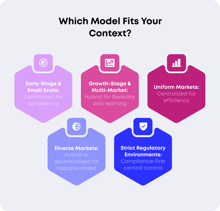 Many businesses address this through a "compliance-first centralization" approach where legal, regulatory, and financial compliance remains tightly centrally controlled even when operational execution is substantially decentralized. This creates a governance model where central teams establish non-negotiable compliance frameworks and monitor adherence, but local teams maintain significant autonomy for commercial and operational decisions within those frameworks.