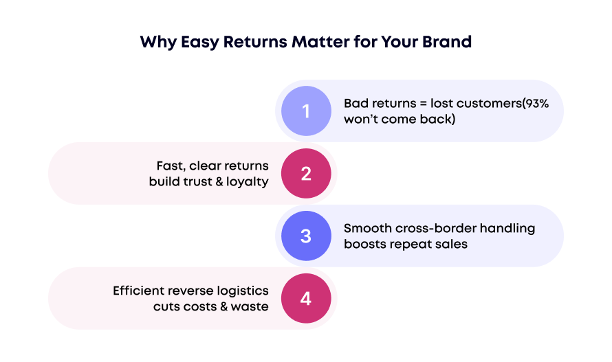 93% of shoppers say they will not buy again after a bad returns experience (Narvar). For cross-border brands, this risk is amplified: delays, customs fees, and lack of clarity can ruin customer satisfaction.
