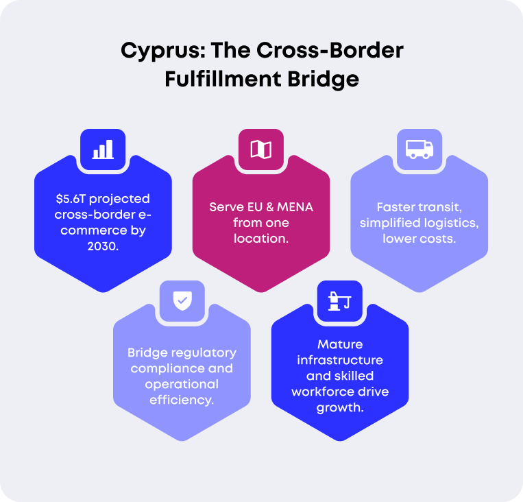 The true strategic value of Cyprus becomes apparent when examining cross-border e-commerce dynamics. Global cross-border e-commerce is projected to grow at twice the rate of domestic e-commerce through 2030, with cross-border sales expected to reach $5.6 trillion by 2030. Businesses positioning themselves to capture this growth need fulfillment locations that provide efficient access to multiple high-growth markets.